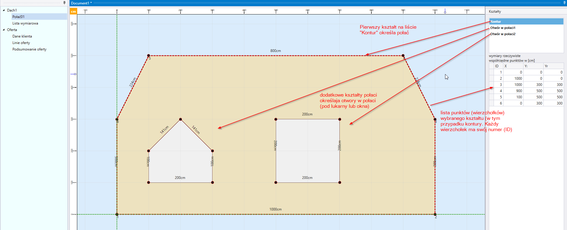 Unusual roofs can be entered slope by slope, so that in the drawing the bottom edge is the edge of the eaves and the top edge is the apex of the slope (ridge). Slopes are represented by a set of shapes. Each shape consists of a list of points. A point is the vertex of a slope shape. Each new slope has at least one shape. The first, default and required slope shape is the slope outline (contour). The points of this shape define the shape and size of the roof slope. If the slope has more than one shape defined, the second and subsequent shapes are the openings in the slope.