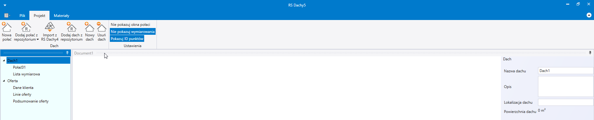 - (1) on the left side, the Document outline, containing information about the dimensions of the objects (roof, elevation), the dimension specification and the quotation