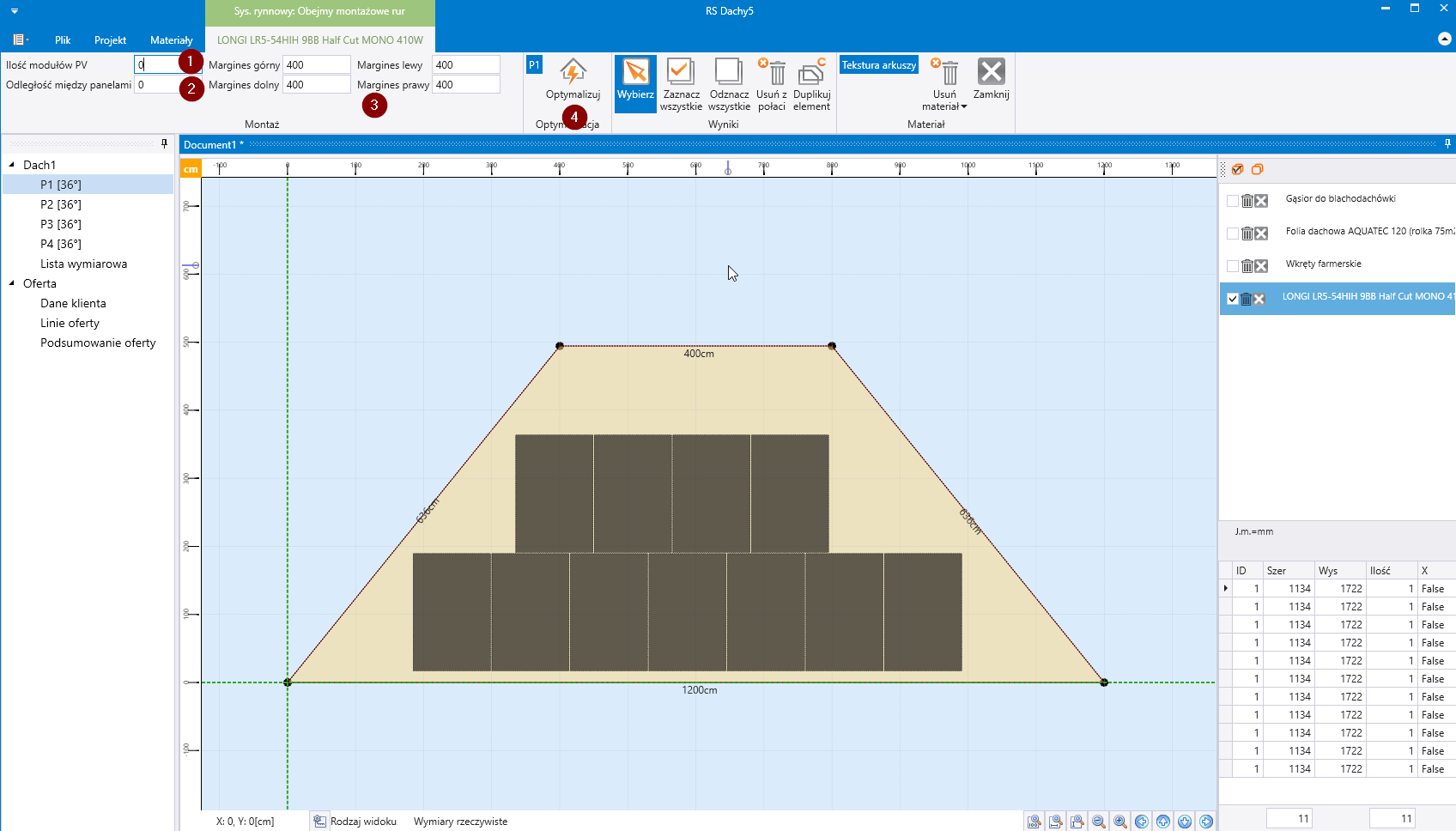 Należy pamiętać aby po zmianie parametrów, zdecydować czy zmiana dotyczy tylko jednej połaci (na screenshot P1) czy wszystkich oraz wybrać przycisk Optymalizuj aby dokonać ponownego przeliczenia.