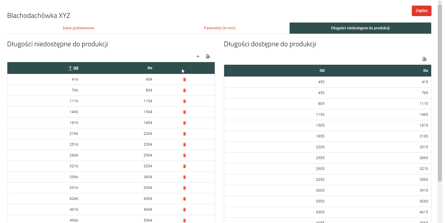 - Minimum length - minimum length of the panel (in mm), specifies the minimum length of the sheet. For metal roofing sheets it should result from the formula: (minimum_number_of_modules*length_of_module)+length_of_laps (bottom and top)