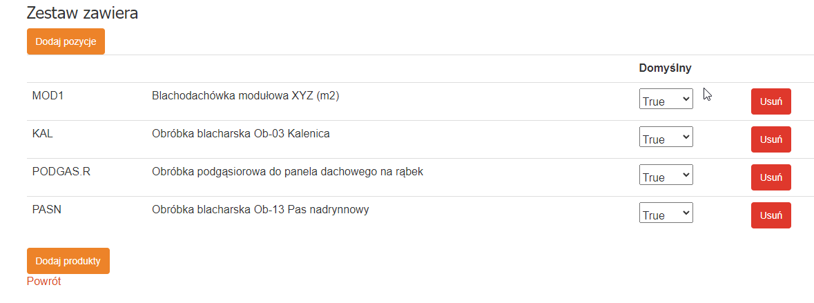 When defining a kit of type guttering and giving it, for example, the name "System guttering X 120/90", all the products included in the kit should be added: connectors, barb, hooks, gutters (various lengths), downpipes (various lengths). The software will optimally select the lengths of gutters and pipes, choosing the appropriate number of hooks (based on the parameters of individual products). A prerequisite for the correct operation of the guttering calculation is a correctly defined roof, with slopes that have a given slope and are correctly connected to each other. A roof generated from the roof wizard (web) or from the roof library (desktop application) meets these criteria.