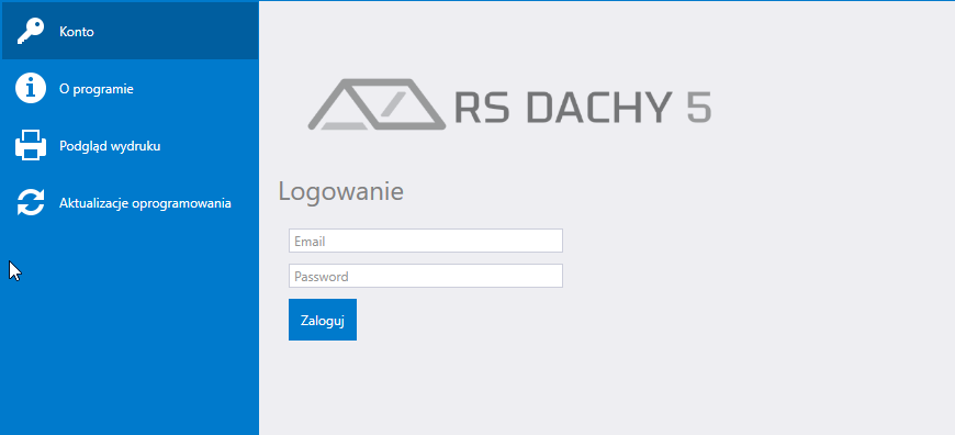 Po uruchomieniu programu użytkownik zostanie poproszony o zalogowanie. Należy użyć adresu email oraz hasła, obecnie używanego podczas logowania na stronie www.rsdachy.pl
