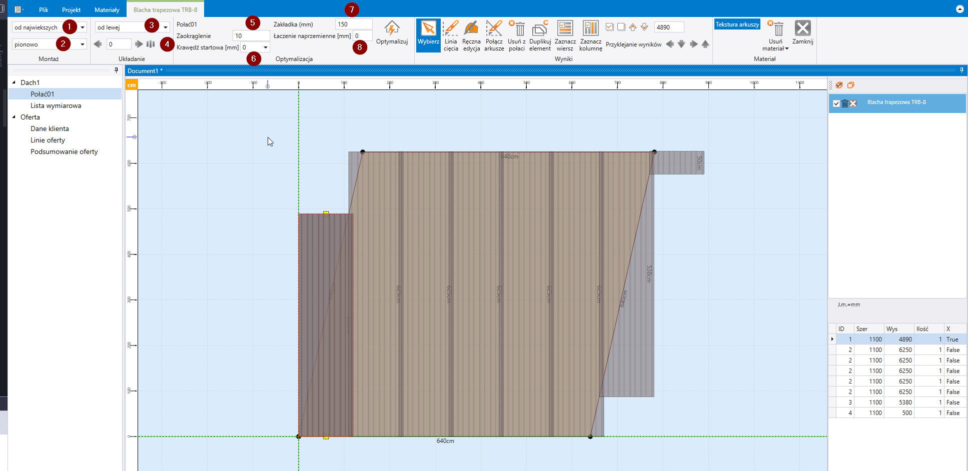 Należy pamiętać aby po zmianie parametrów, zdecydować czy zmiana dotyczy tylko jednej połaci (na screenshot Połać1) czy wszystkich oraz wybrać przycisk Optymalizuj aby dokonać ponownego przeliczenia.