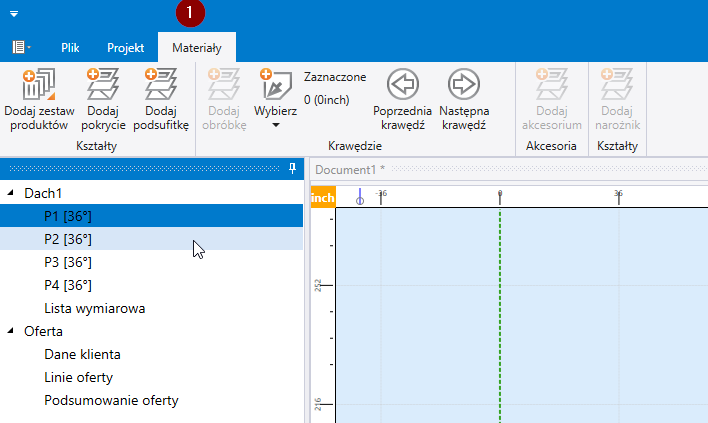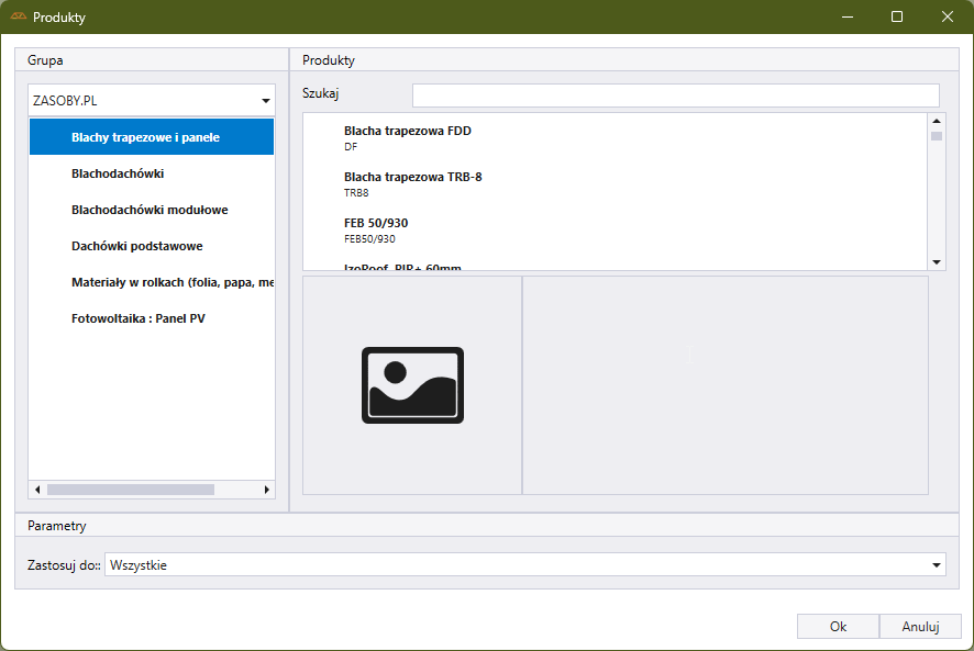 Warunkiem kalkulacji jest zdefiniowanie połaci dachu lub elewacji. Aby wybrać produkty, do wykonania kalkulacji należy