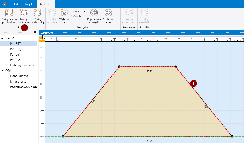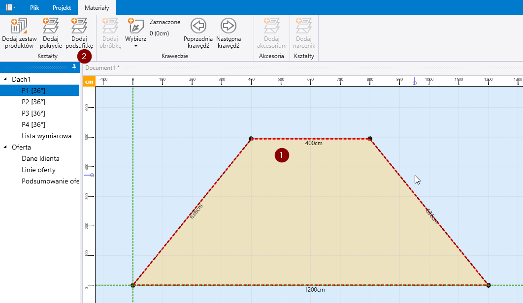 Dodanie podsufitki jest możliwe, gdy kształt połaci jest zaznaczony (1). Materiał dodaje się przyciskiem Dodaj podsufitkę (2)