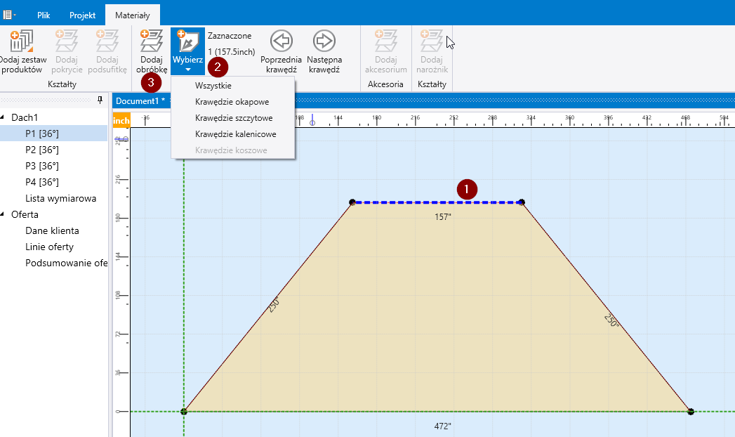 Aby dodać obróbkę na krawędzi połaci, jedna lub więcej krawędzi musi być zaznaczonych (1). Za pomocą opcji (2) Wybierz można zaznaczyć więcej krawędzi danego typu. Gdy krawędzie zostaną wybrane należy wybrać przyciskiem Dodaj obróbkę (3) odpowiednie materiały.