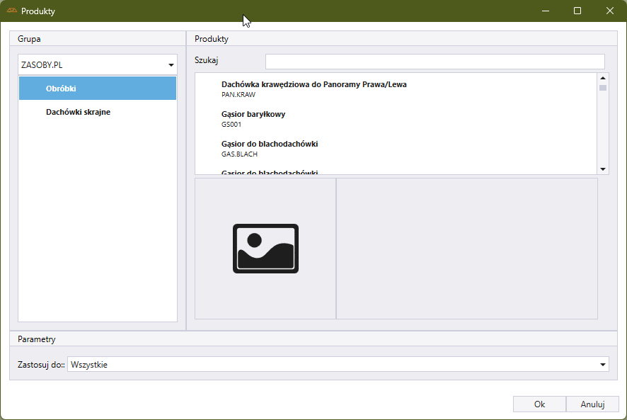 Przed zatwiedzeniem produktu, w polu Zastosuj do możemy wybrać czy materiał ma zostać dodany do wszystkich połaci czy tylko do wybranej.