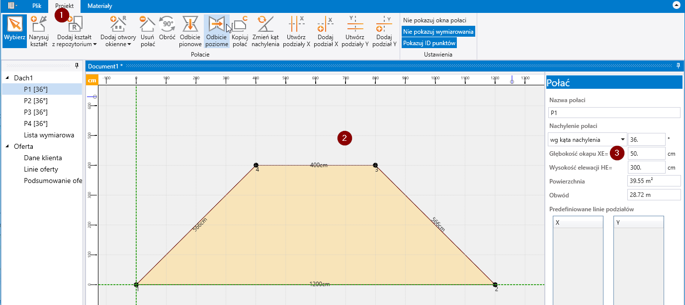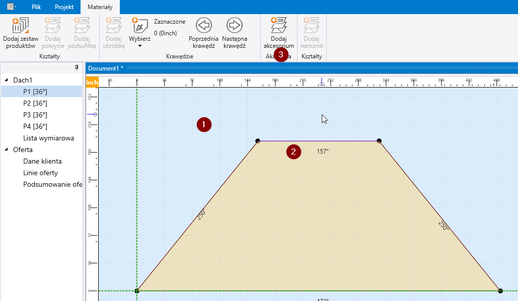 Aby dodać akcesorium, trzeba kliknąć poza obszar połaci, (1) tak aby ani połać ani krawędź nie była zaznaczona (2). Następnie wybrać przycisk (3) Dodaj akcesorium