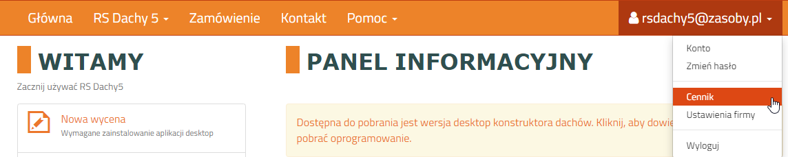 Domyślne ceny produktów na ofercie można zdefiniować w module cenników. Opcja cenników dostępna jest po zalogowaniu i wybraniu z menu użytkownika opcji Cennik.