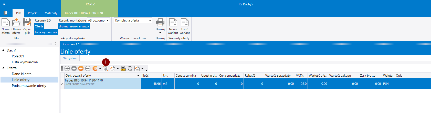 Na zakładce Linie oferty dla produktów z określonym schematem możemy wybrać ikonę (1) aby określić cechy