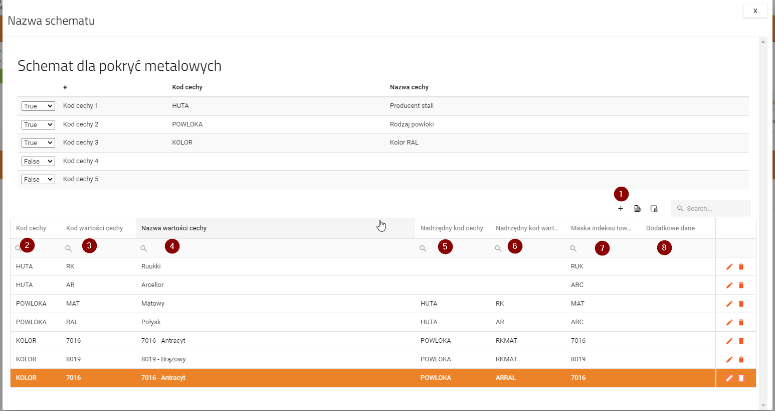 - (6) Nadrzędny kod wartości cechy. Pozycja będzie wyświetlona, gdy cecha nadrzędna o podanym kodzie wartości zostanie wybrana dla cech z niższym numerem. Ważne aby kod nadrzędny był konkatenacją wszystkich cech nadrzędnych. Jeśli na podanym przykładzie podczas definiowania koloru, kod huty ma kod AR, a kod powłoki ma RAL to kod cechy nadrzędnej dla KOLOR powinna mieć wartość ARRAL co oznacza, że jest to kolor po wybraniu huty AR oraz powłoki RAL