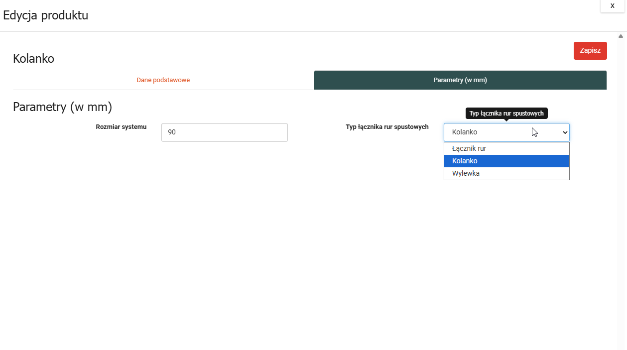 Główny parametr tego produktu to Typ łącznika rur spustowych - wyróżniamy 3 typy łączników rur spustowych: