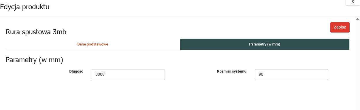 Rury spustowe służą odprowadzeniu wody z rynien. System kalkuluje ilość i długość rur spustowych na podstawie wysokości elewacji. Jeśli w zestawie znajduje się kilka rur spustowych o różnych długościach (1m,2m,3m). System wybierze najbardziej optymalną konfigurację długości rur. Przy definiowaniu rur spustowych podstawowy paramer to Długość - określa długość rury spustowej w mm.