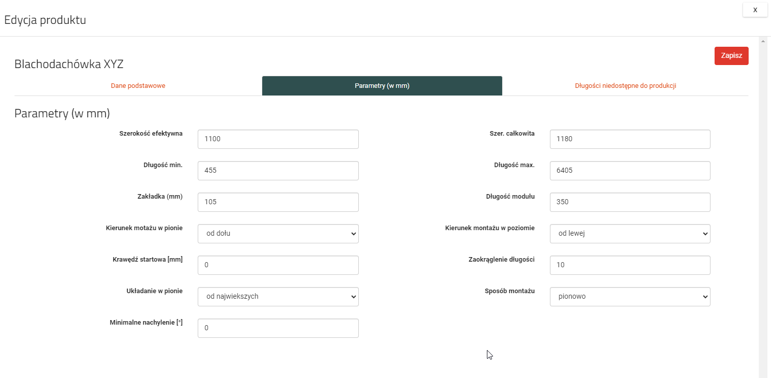 - Długość min. - minimalna długość panela (w mm), określa minimalną długość arkusza. Dla blachodachówek powinna wynikać ze wzoru: (minimalna_ilość_modułów*długość_modułu)+długość_zakładek (dolnej i górnej)